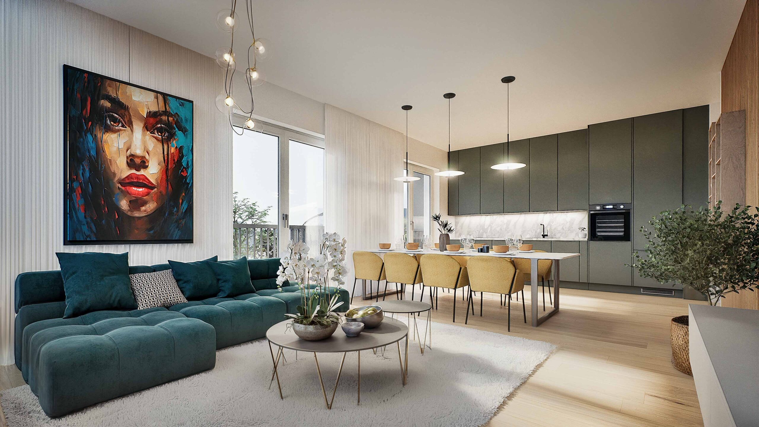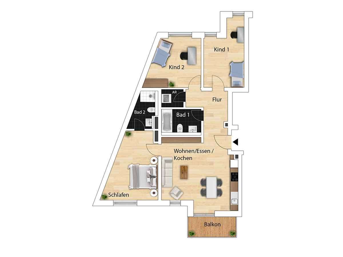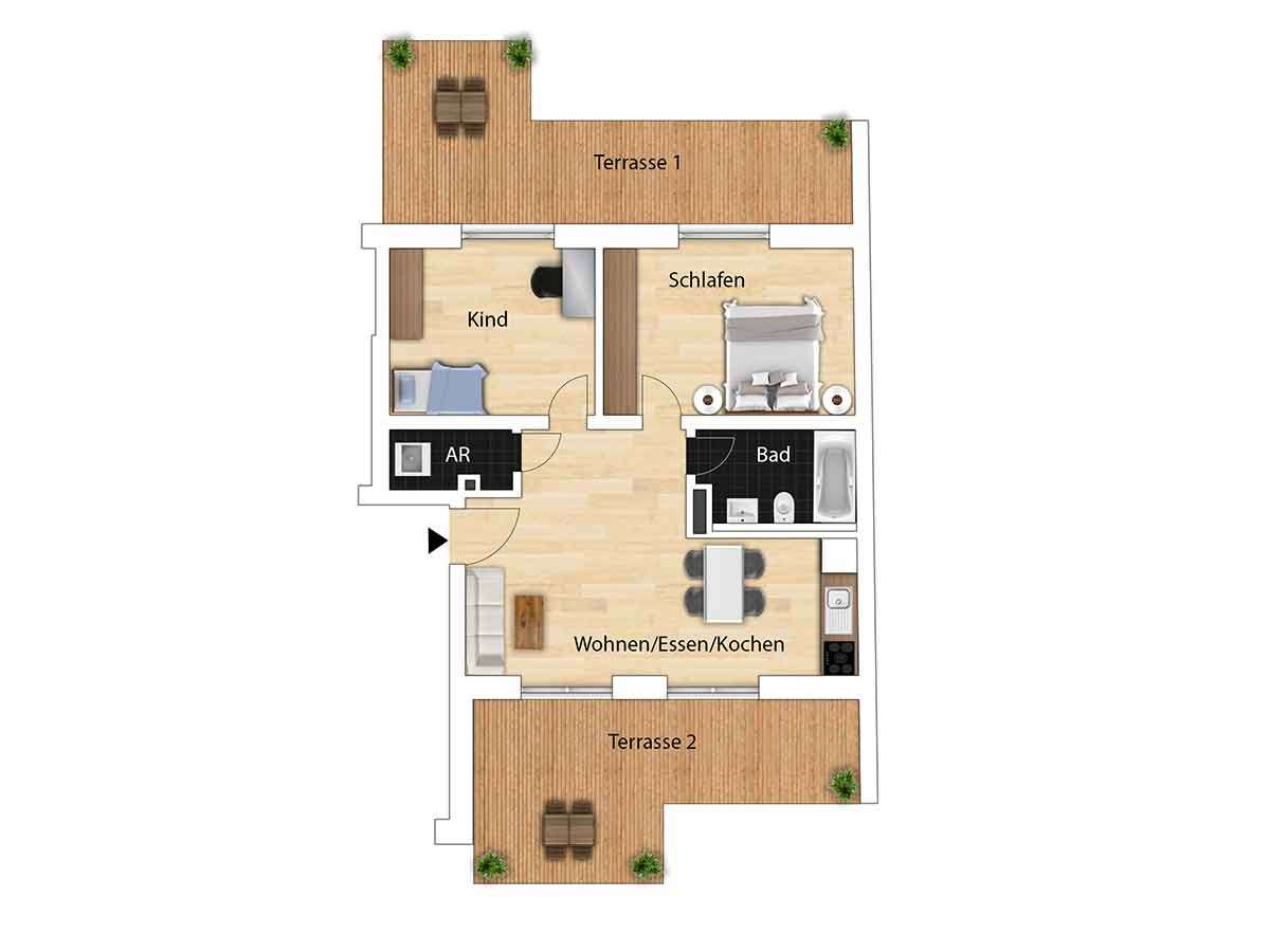Alle Illustrationen, Bilder, Pläne sowie die Beschreibungen sind unverbindlich. Möblierungsvorschläge, Küchen, und Einrichtungen gehören nicht zum Standardkaufgegenstand und sind nicht im Kaufpreis enthalten.